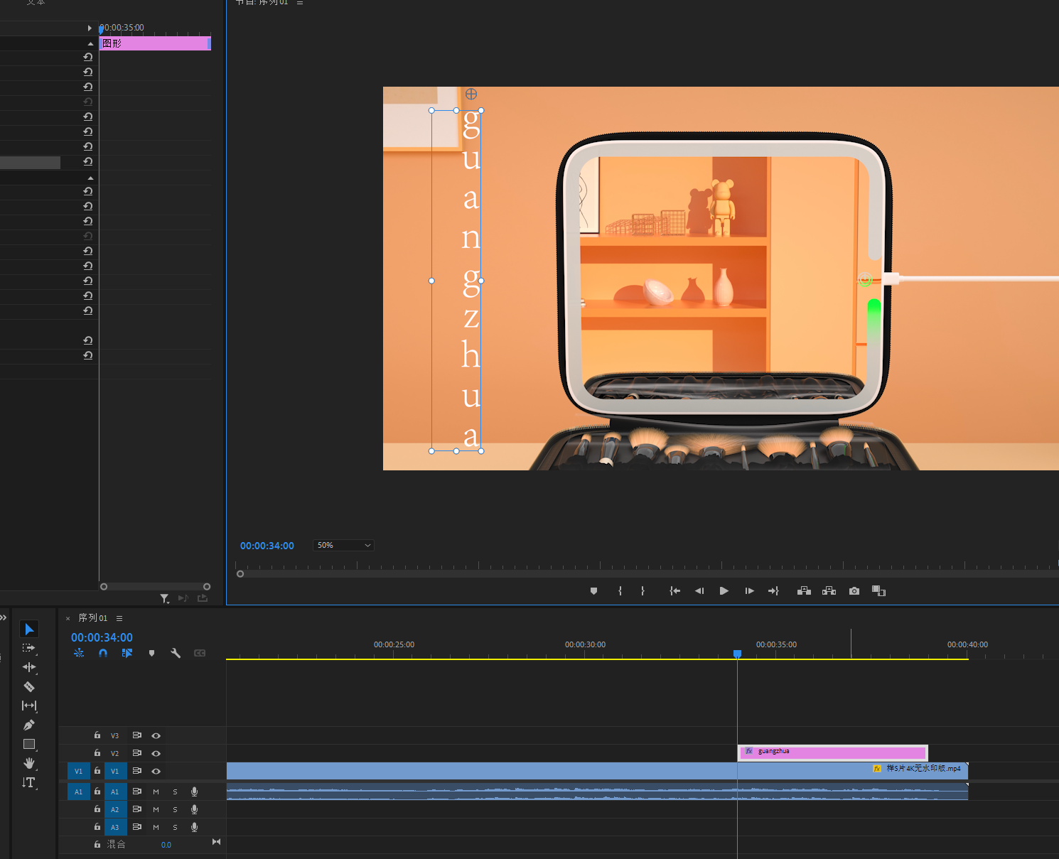 使用方法:切换到垂直文字工具后直接在预览视窗上单击,这时就会出现一个纵向文字框,在时间线上也会生成一个文字素材