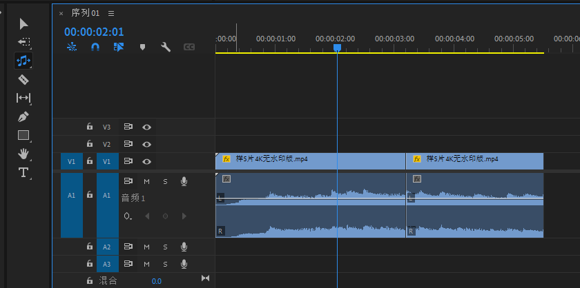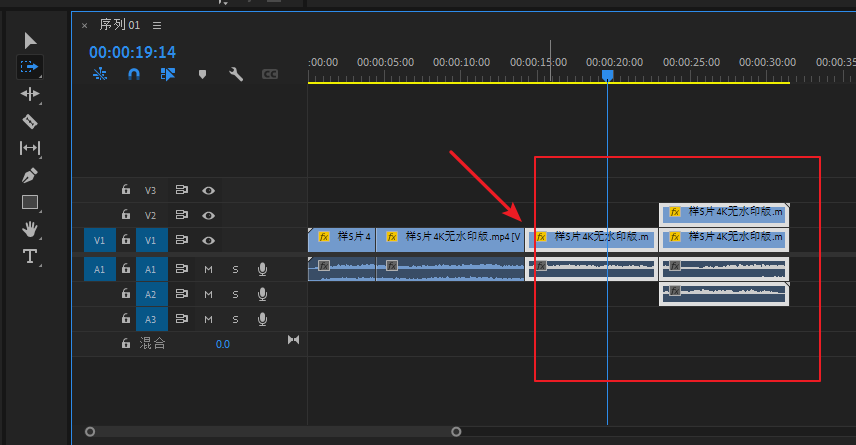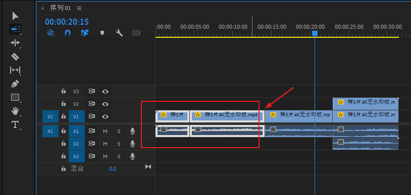 向后选择轨道工具:就是在鼠标指针所在的素材分割点处,向后所有的素材都会被选择上。