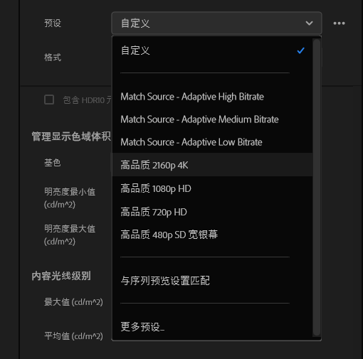 预设选项中除了PR提供得几种品质(质量)选项之外,还可以自定义品质(质量),就是在比特率设置中调整比特率值。