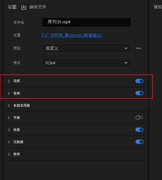 导出视频与导出音频的开关默认是打开的,如果不需要哪一项就关闭哪一项。