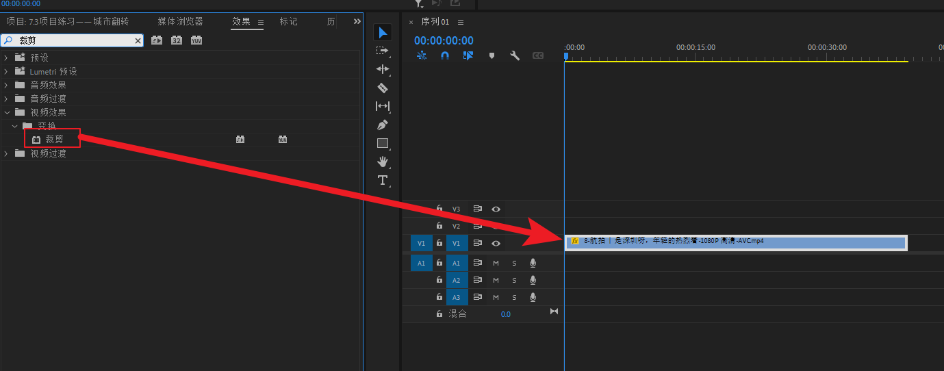 在效果面版搜索“裁剪”,然后将它加入到素材上