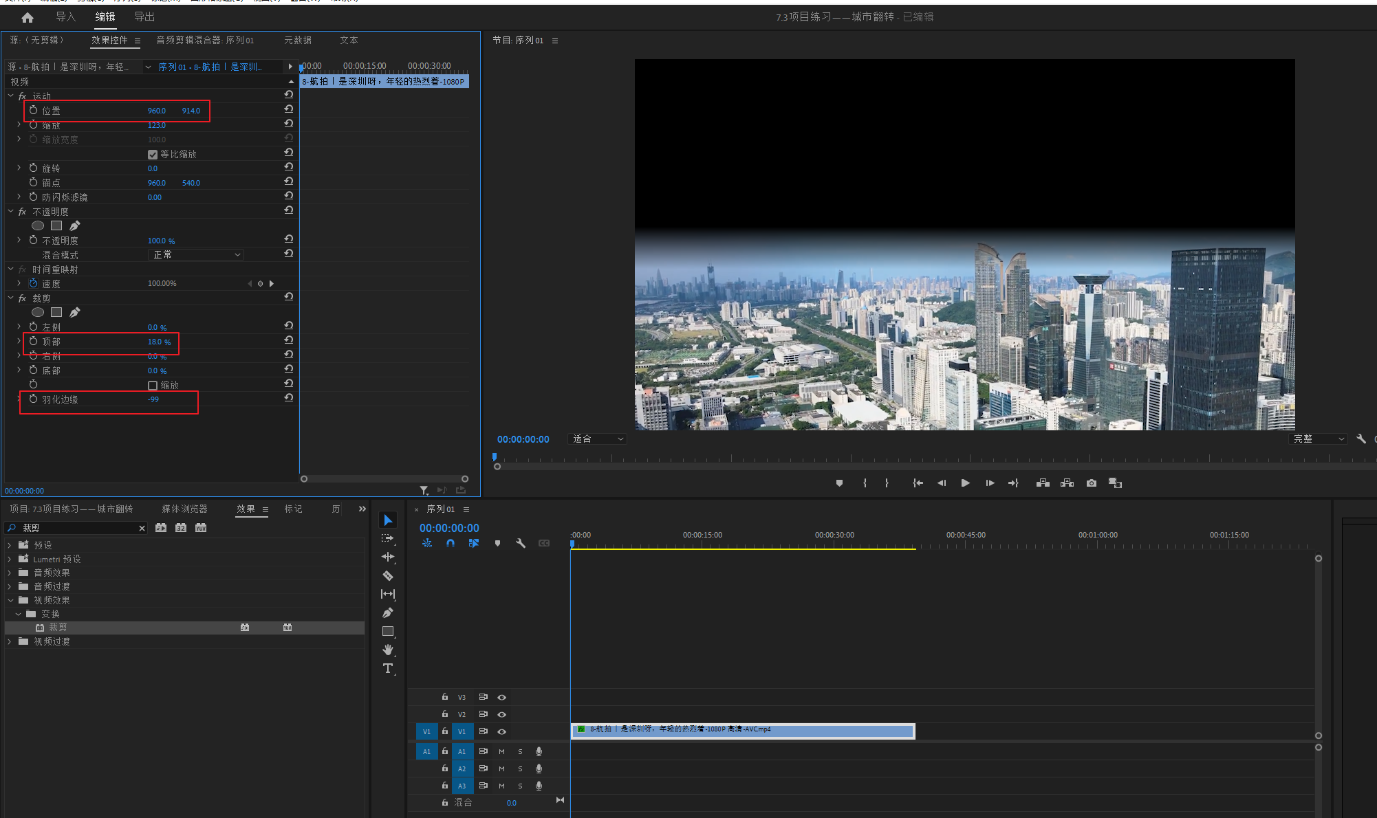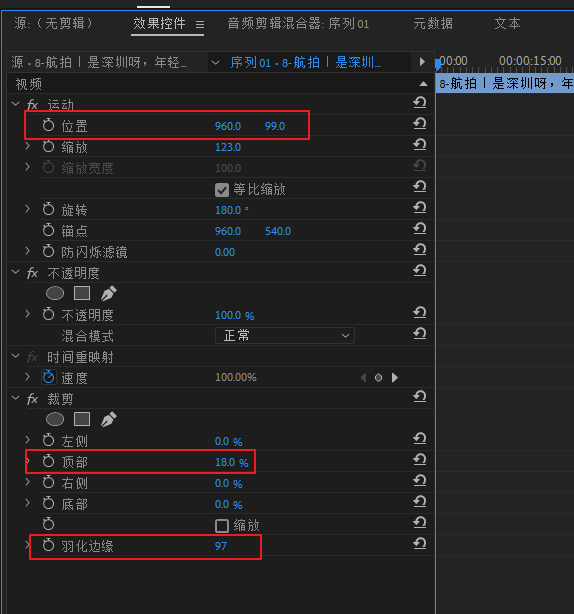 然后调整裁剪的顶部数值与羽化数值,再调整一下素材的位置