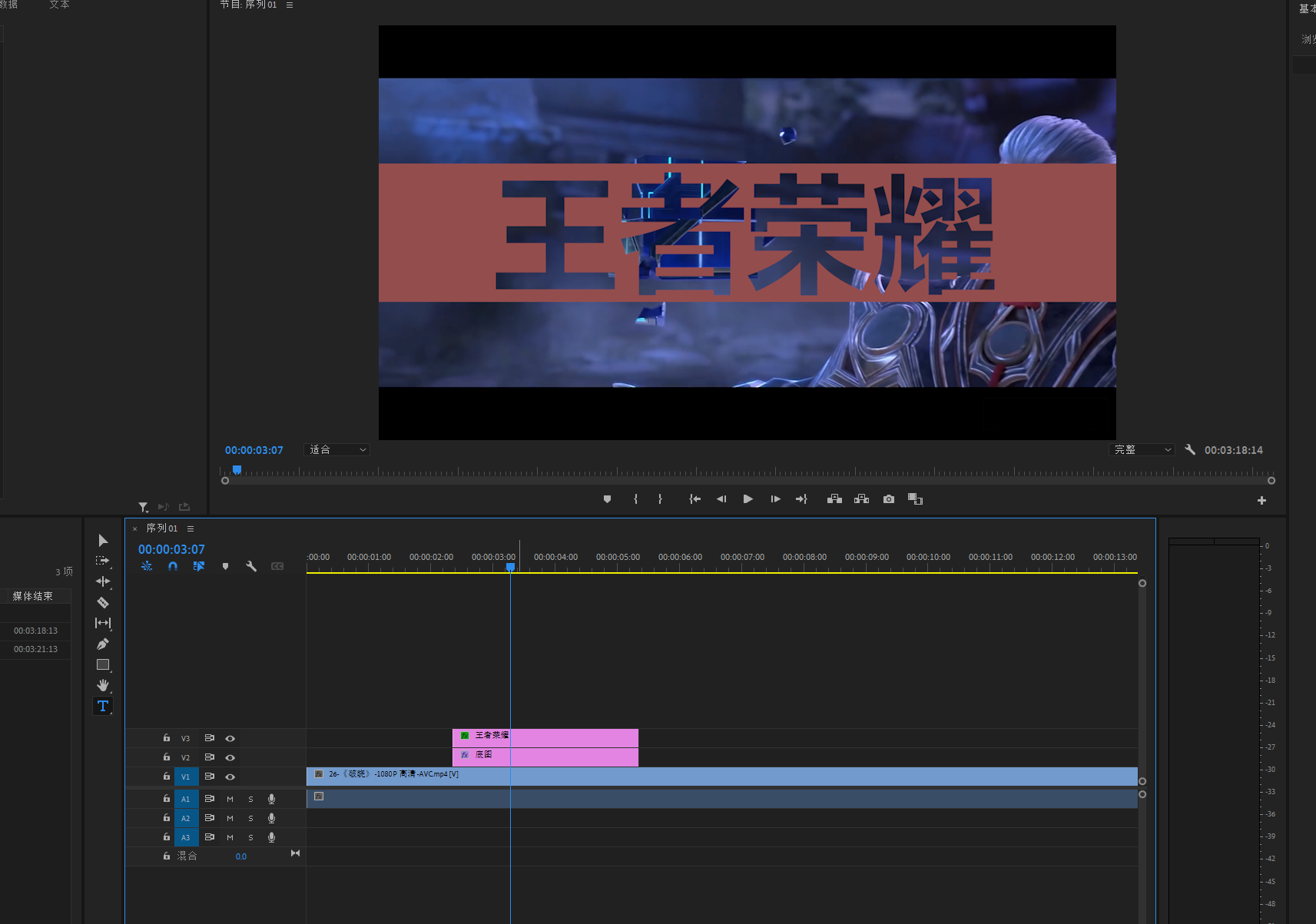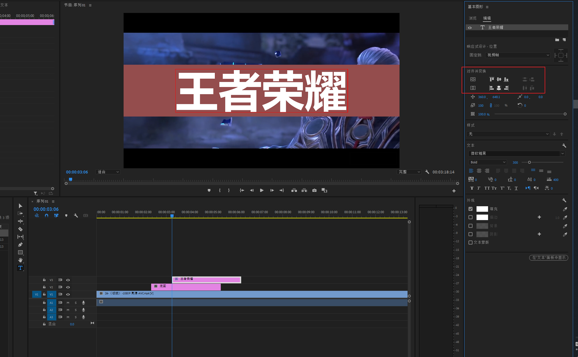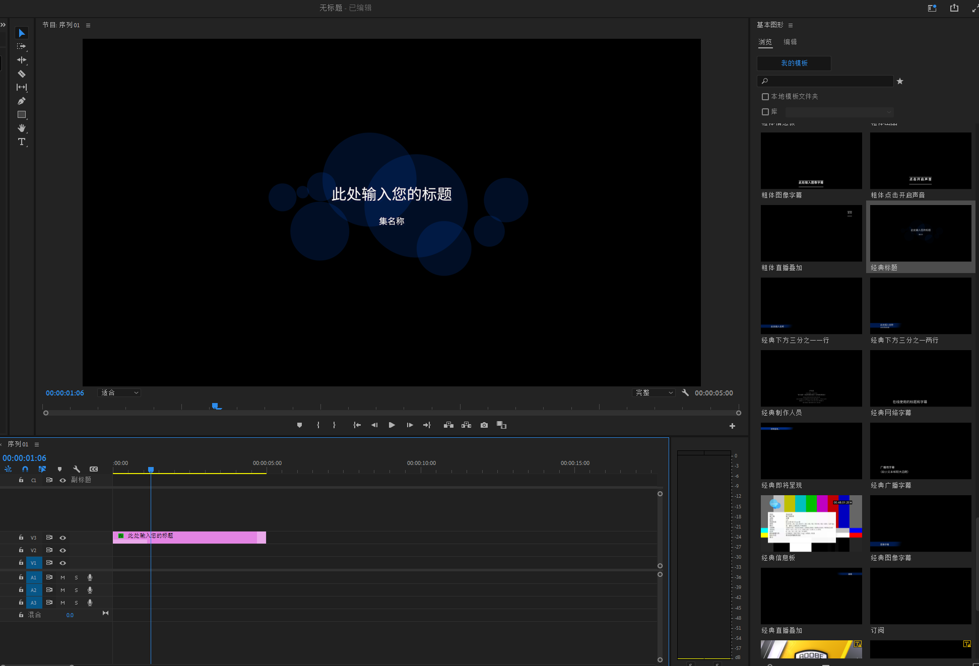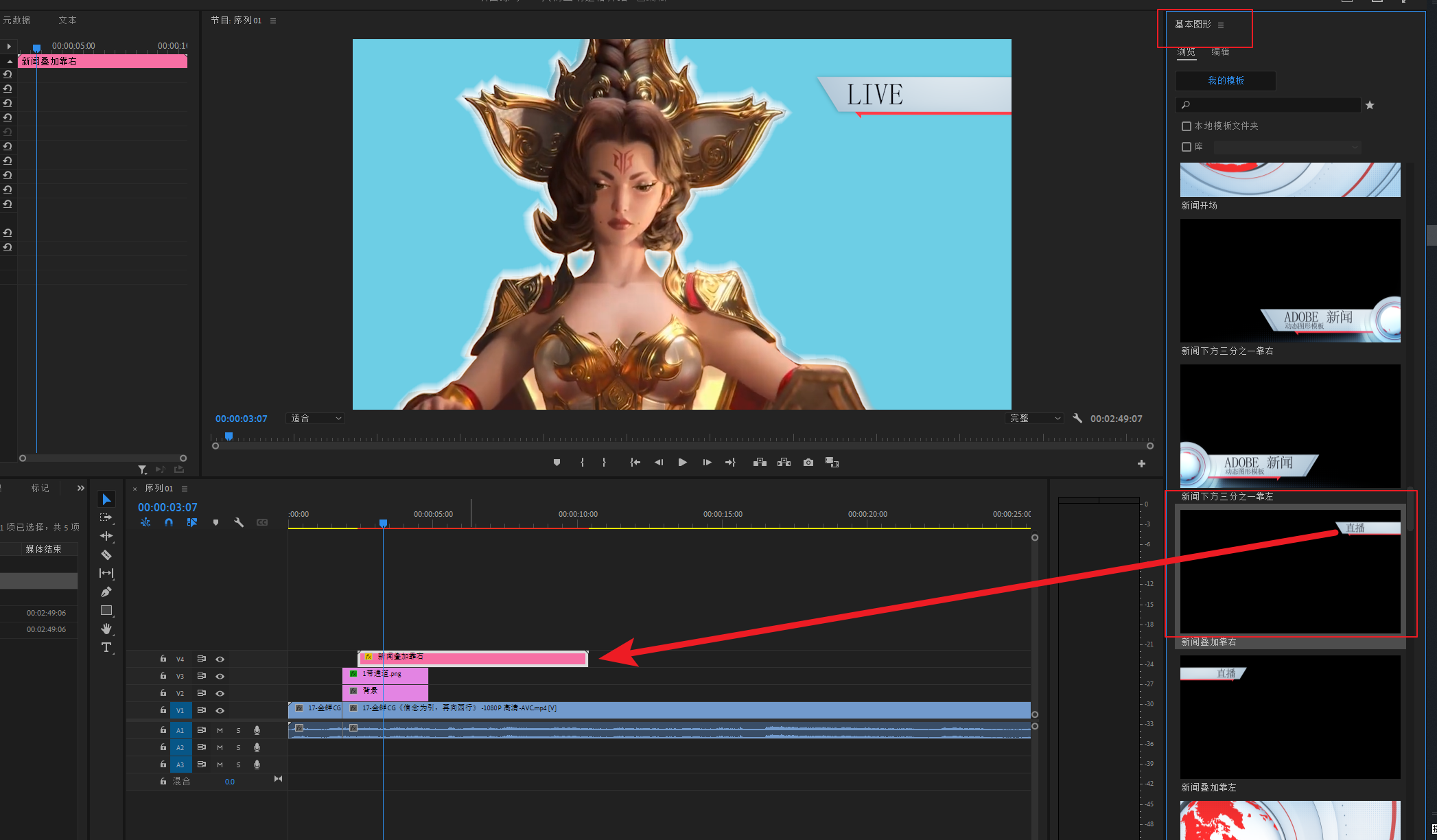 在基本图形面版中,选择一个字幕模板拖拽到视频轨道上