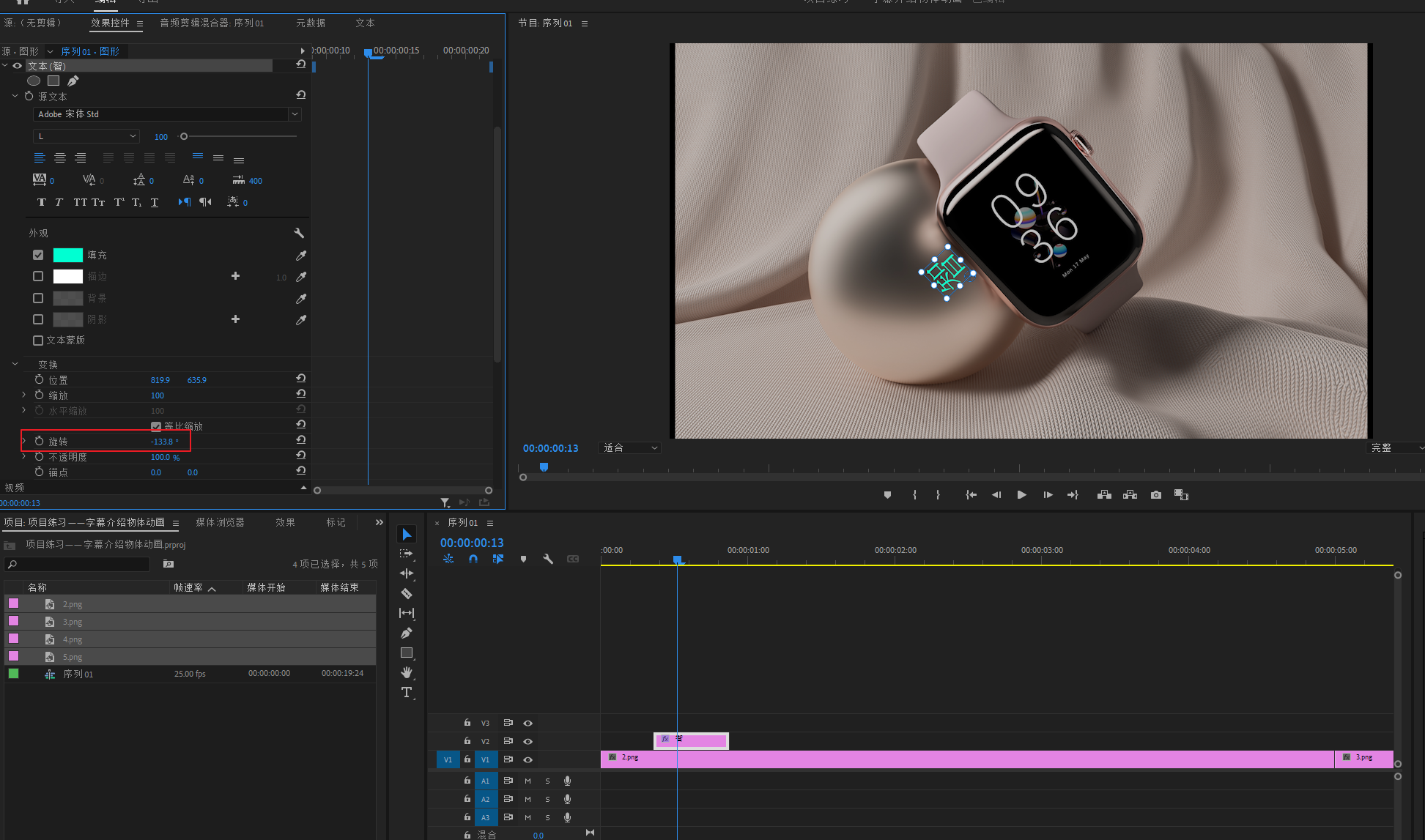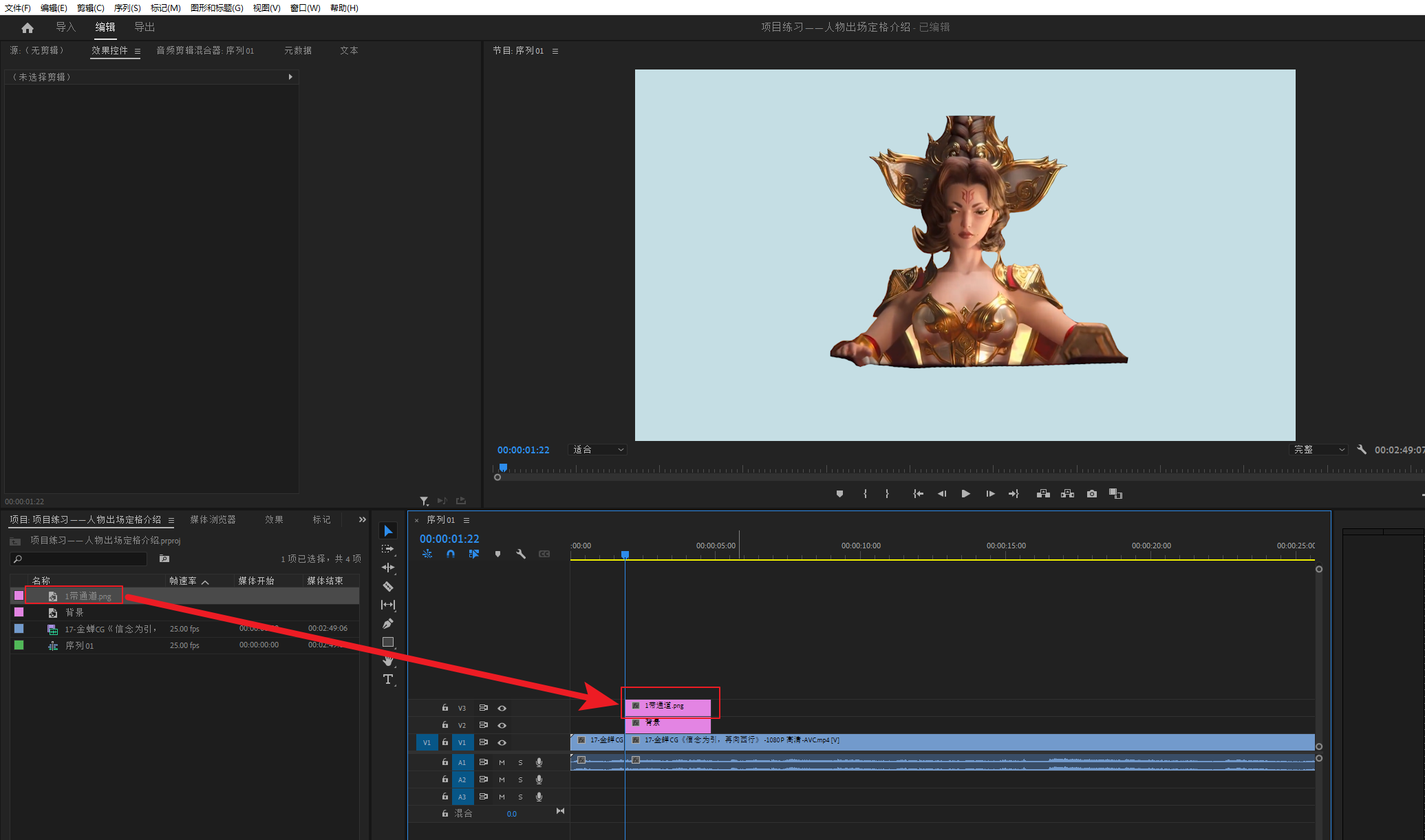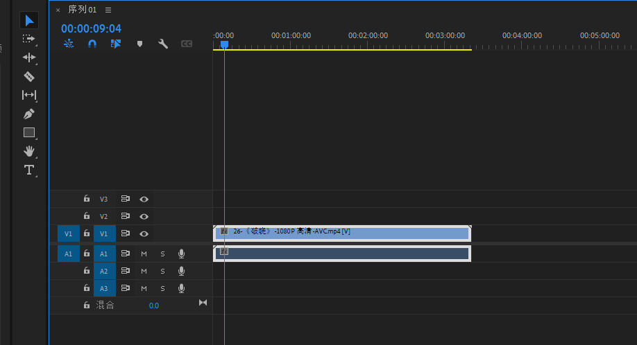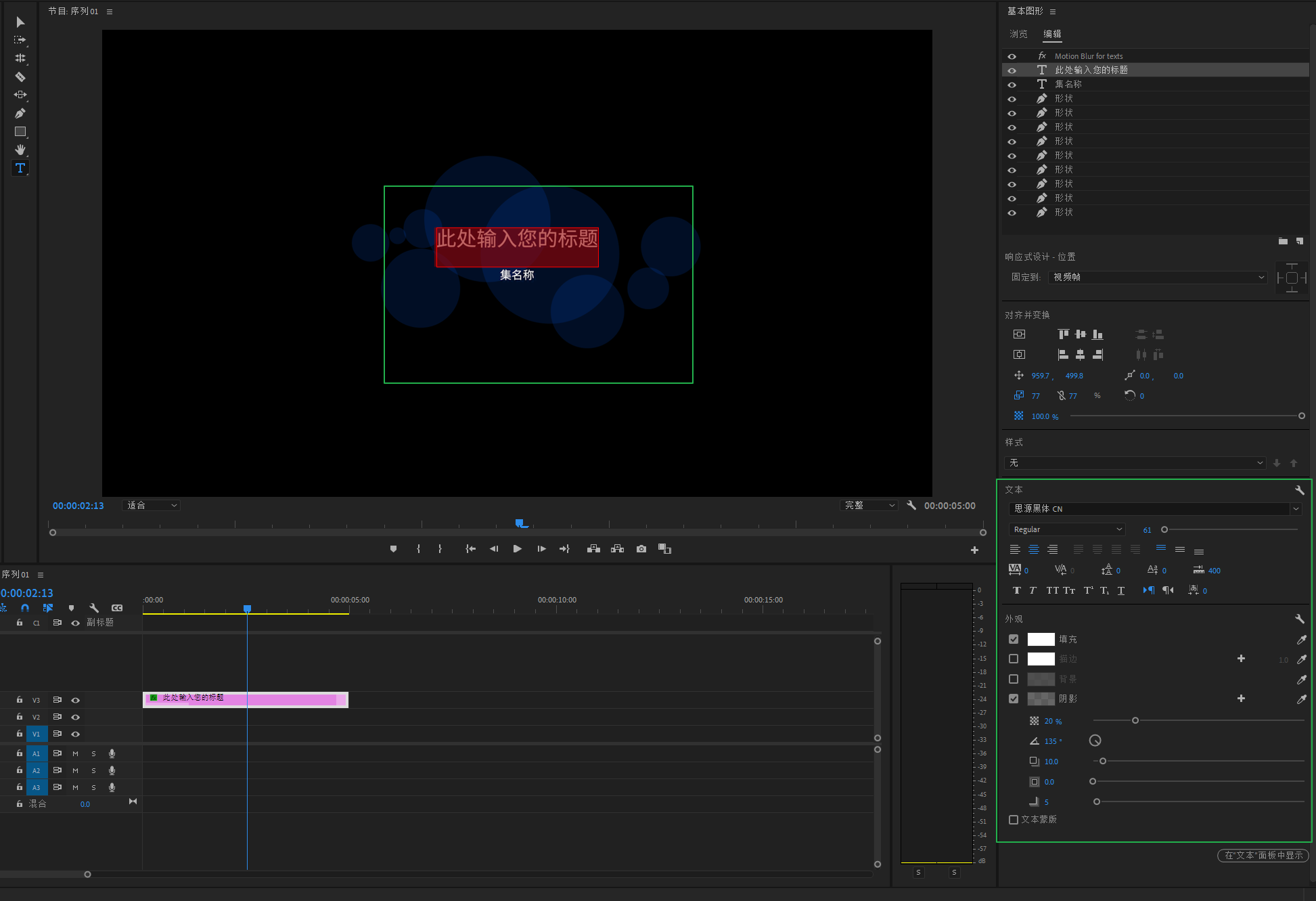 在基本图形面版中,选择一个字幕模板拖拽到视频轨道上