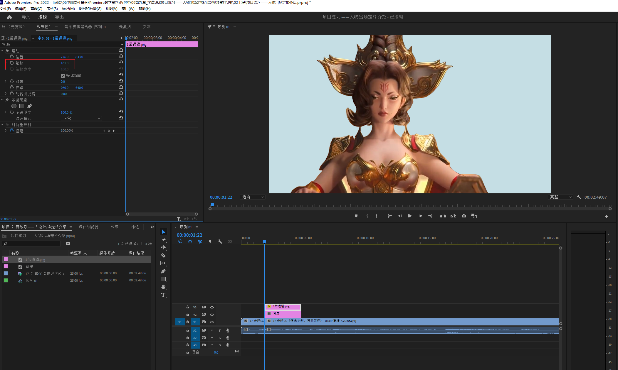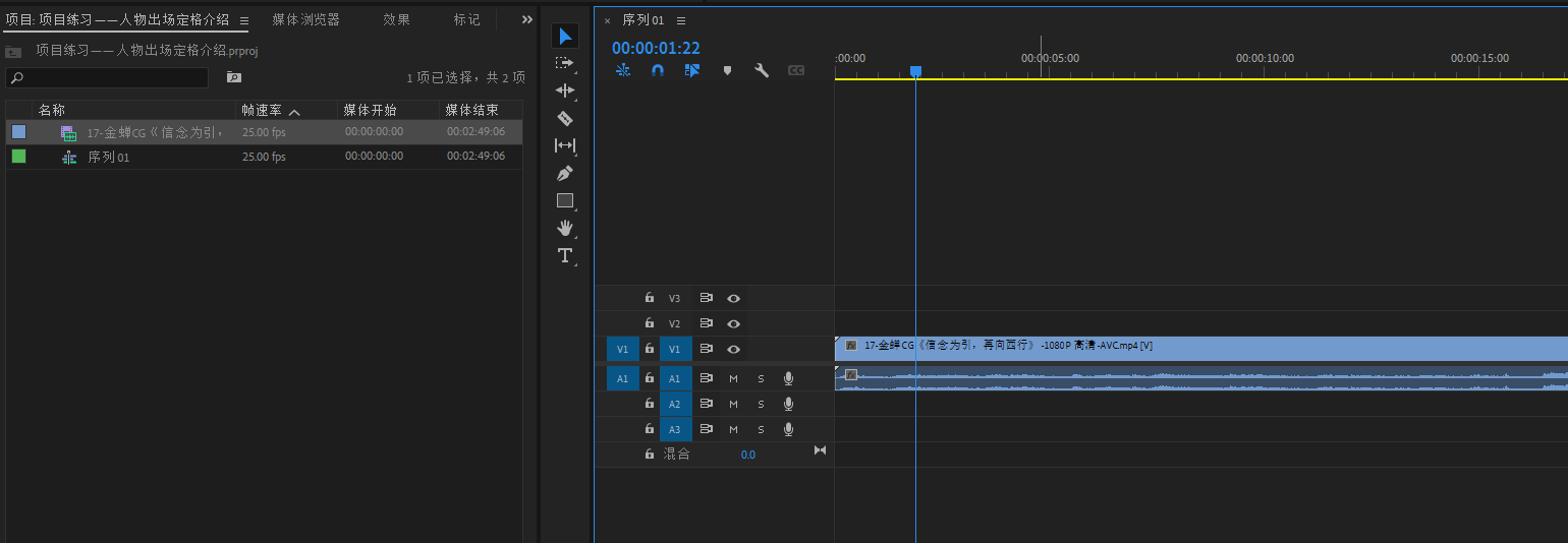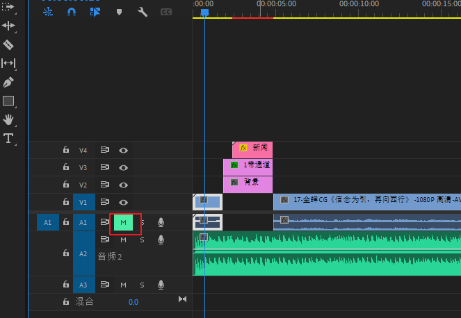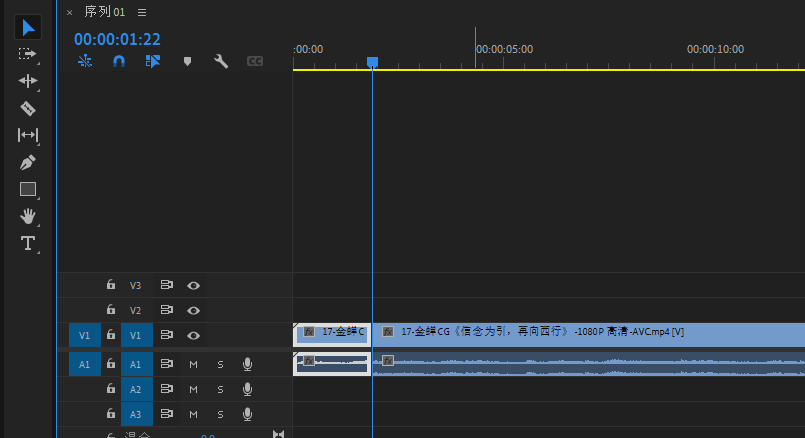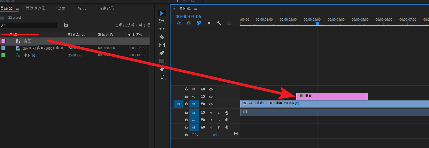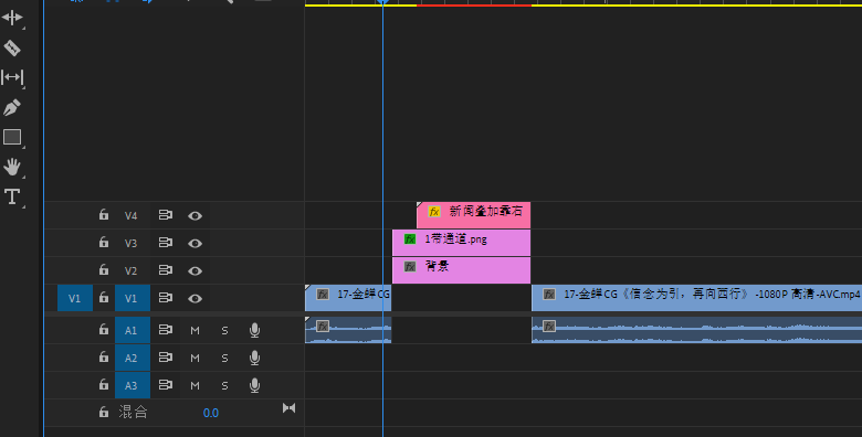 将刚才做抠图的1带通道层拖入到轨道上,对准刚才素材的切割口,放在背景层的上方轨道,与背景层长短对齐。