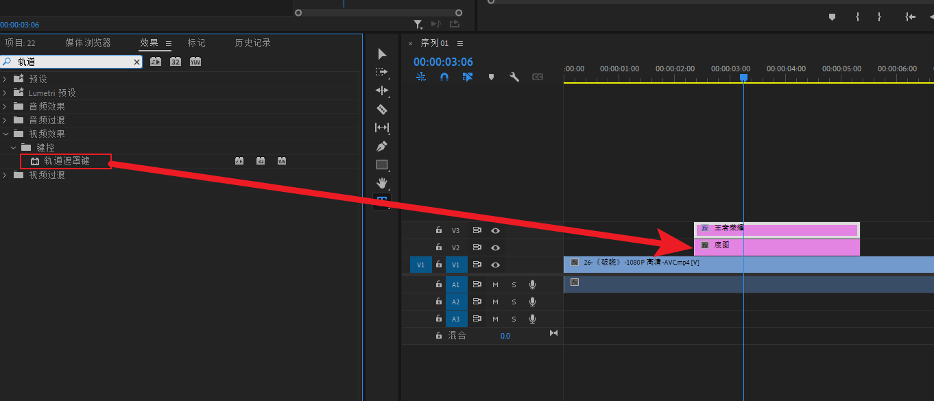 在效果面版中找到“轨道遮罩键”效果拖拽给底图使用
