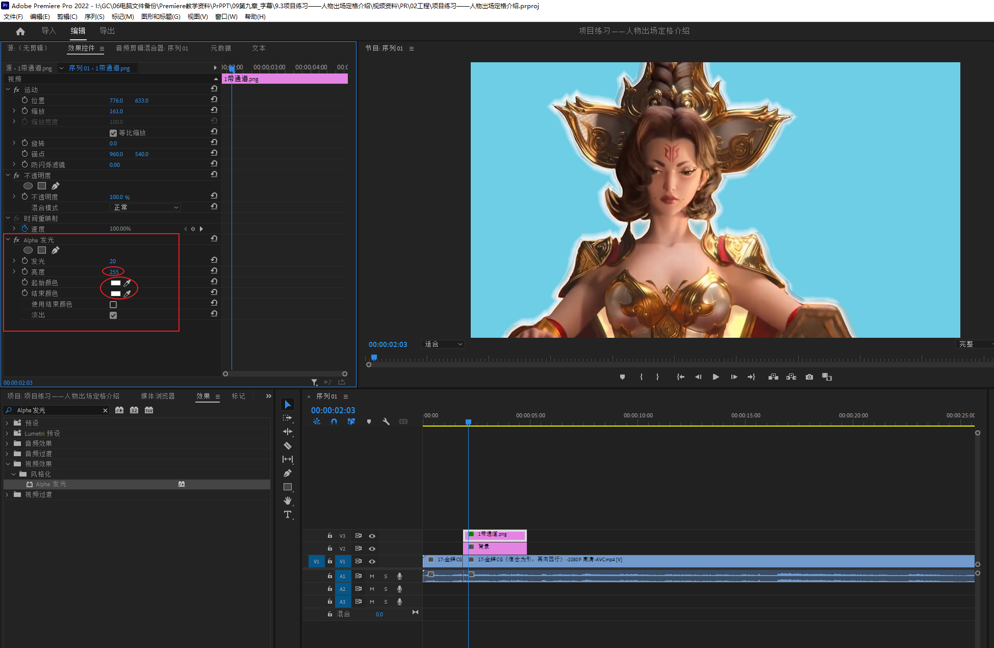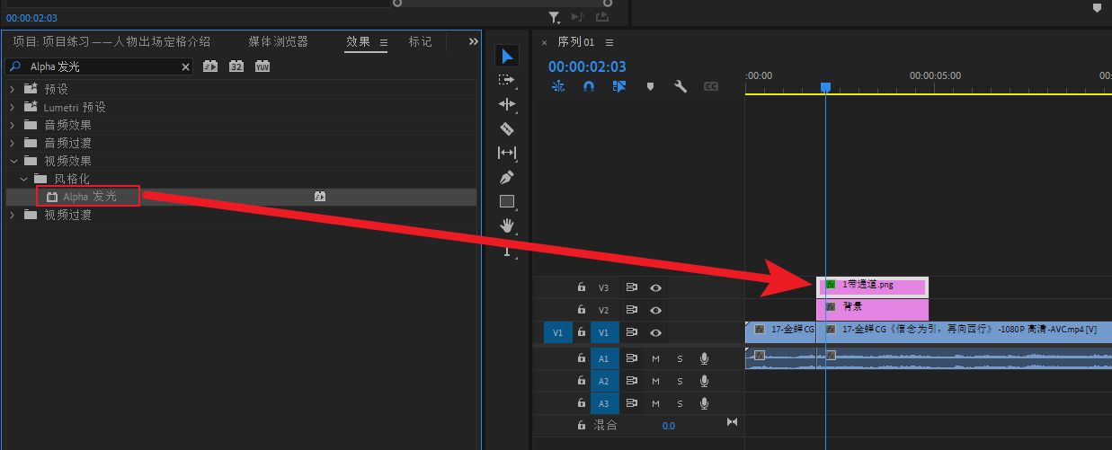 在效果栏搜索“Alpha 发光”,添加到1带通道层。