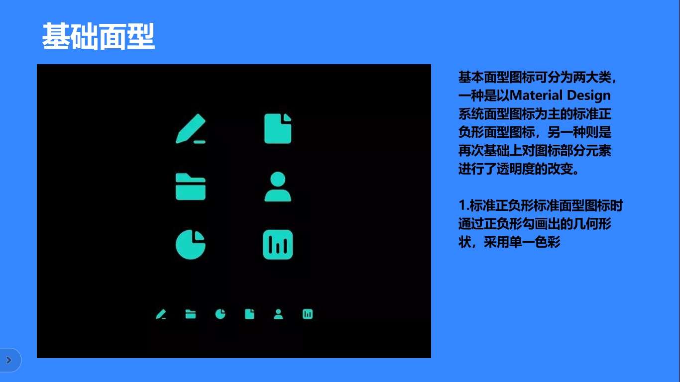 基本面型图标可分为两大类,一种是以Material Design系统面型图标为主的标准正负形面型图标,另一种则是再次基础上对图标部分元素进行了透明度的改变。
