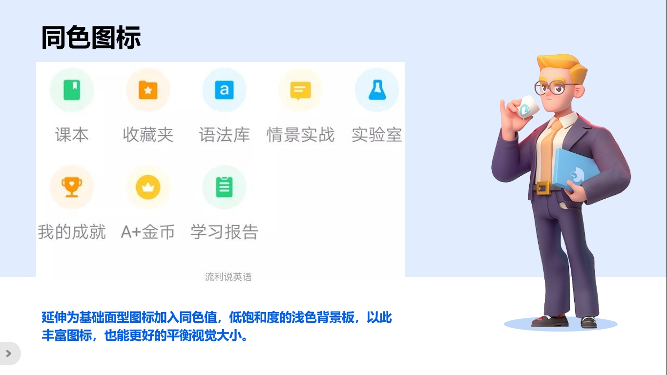 延伸为基础面型图标加入同色值,低饱和度的浅色背景板,以此丰富图标,也能更好的平衡视觉大小,如图3。