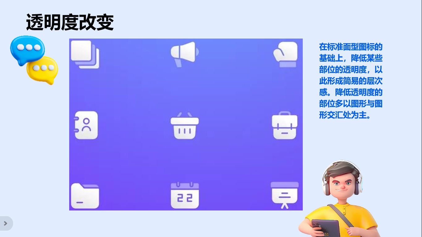 在图标的设计过程中,我们也可以尝试更改图标的颜色透明度来增加层次,不过需要注意的是,在不同的图标中,我们需要将透明度进行统一,以避免被用户误解。
