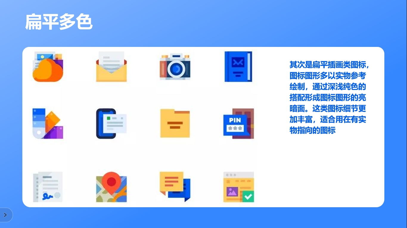 扁平多色将图标拆分为多个图形,针对不同的图形分别上色,简单的是双色、三色图标,色彩使用更加容易上手。