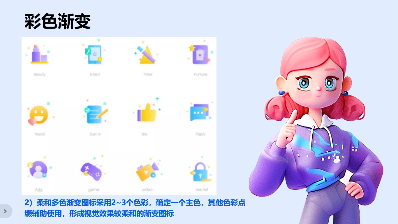 柔和多色渐变图标采用2~3个色彩,确定一个主色,其他色彩点缀辅助使用,形成视觉效果较柔和的渐变图标,如图6。