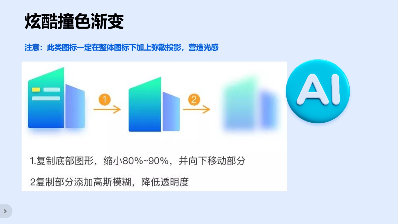 单色渐变图标渐变色彩采用统一色值,通过改变明度饱和度形成柔和的单色渐变。为了使图标看起来更加有层次感,可以为内部图形增加小投影,图标整体添加弥散投影。