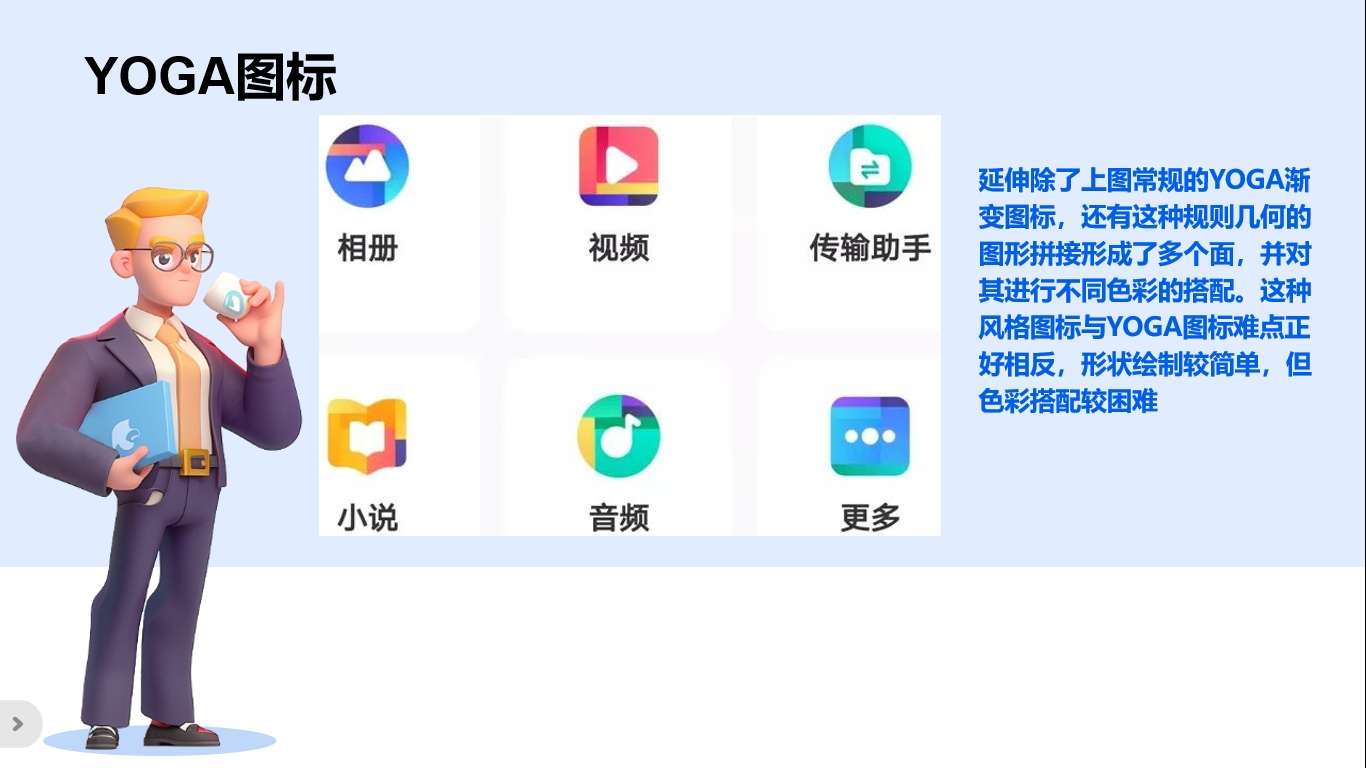 延伸除了上图常规的YOGA渐变图标,还有这种规则几何的图形拼接形成了多个面,并对其进行不同色彩的搭配。这种风格图标与YOGA图标难点正好相反,形状绘制较简单,但色彩搭配较困难。