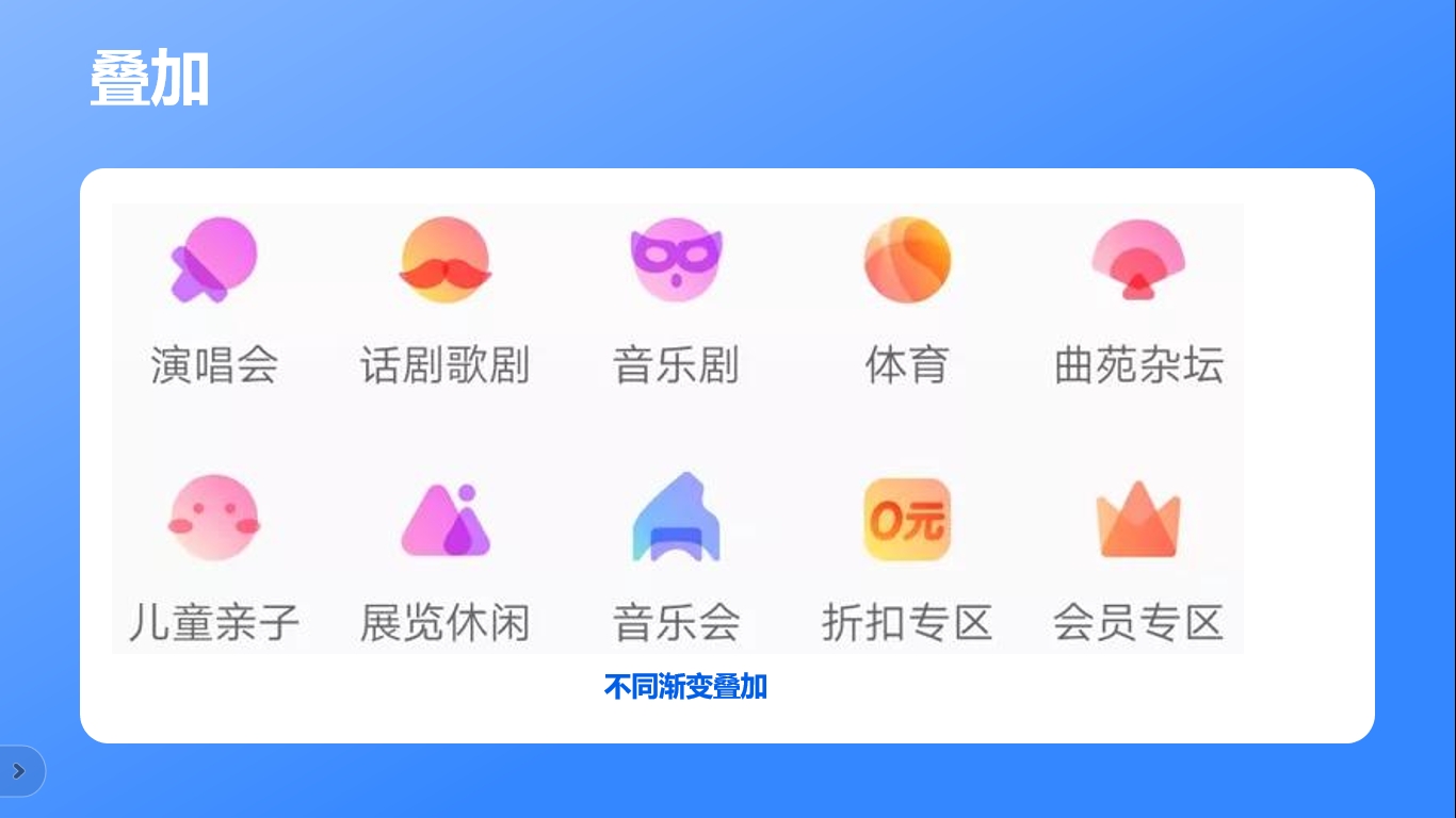 叠加类面型图标可以通过不同色彩叠加,也可以通过不同渐变叠加。特点就是图标图形由多个几何图形构成,1~2个图形之间进行叠加,形成层次感。不同色彩叠加。