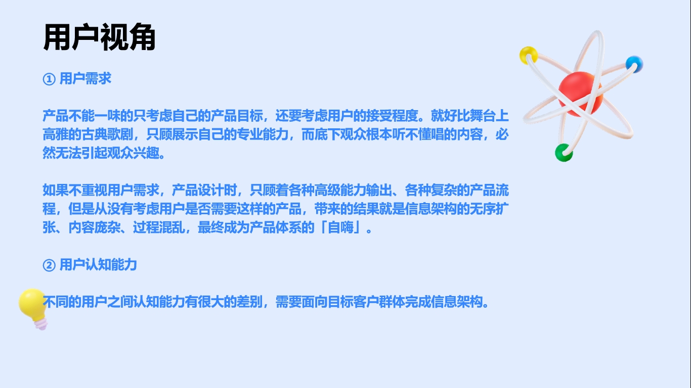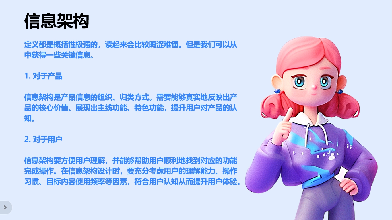 定义都是概括性极强的,读起来会比较晦涩难懂。但是我们可以从中获得一些关键信息。1. 对于产品信息架构是产品信息的组织、归类方式。需要能够真实地反映出产品的核心价值、展现出主线功能、特色功能,提升用户对产品的认知。2. 对于用户信息架构要方便用户理解,并能够帮助用户顺利地找到对应的功能完成操作。在信息架构设计时,要充分考虑用户的理解能力、操作习惯、目标内容使用频率等因素,符合用户认知从而提升用户体验,如图7。