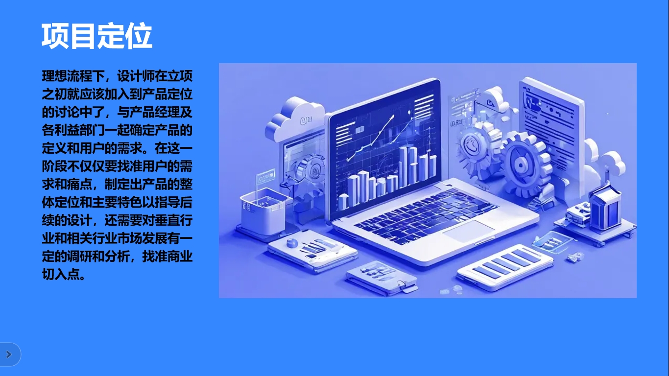 理想流程下,设计师在立项之初就应该加入到产品定位的讨论中了,与产品经理及各利益部门一起确定产品的定义和用户的需求。在这一阶段不仅仅要找准用户的需求和痛点,制定出产品的整体定位和主要特色以指导后续的设计,还需要对垂直行业和相关行业市场发展有一定的调研和分析,找准商业切入点,如图2。