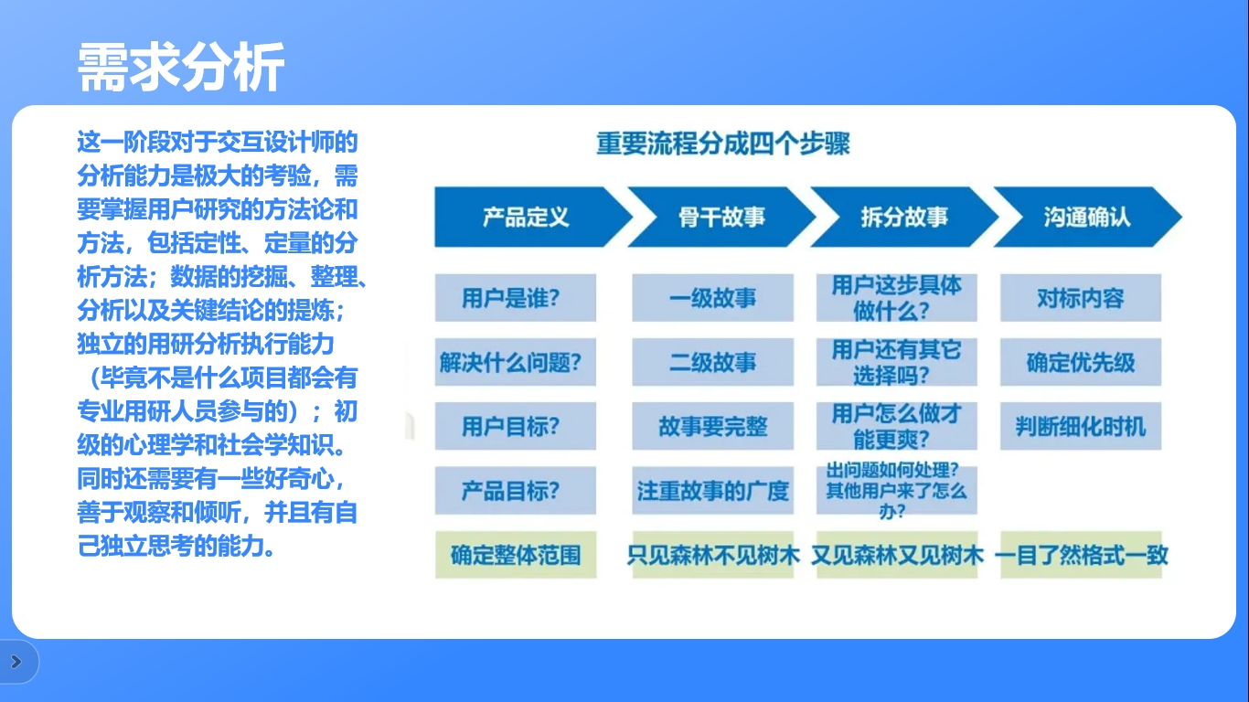 这一阶段对于交互设计师的分析能力是极大的考验,需要掌握用户研究的方法论和方法,包括定性、定量的分析方法;数据的挖掘、整理、分析以及关键结论的提炼;独立的用研分析执行能力(毕竟不是什么项目都会有专业用研人员参与的);初级的心理学和社会学知识。同时还需要有一些好奇心,善于观察和倾听,并且有自己独立思考的能力,如图5。
