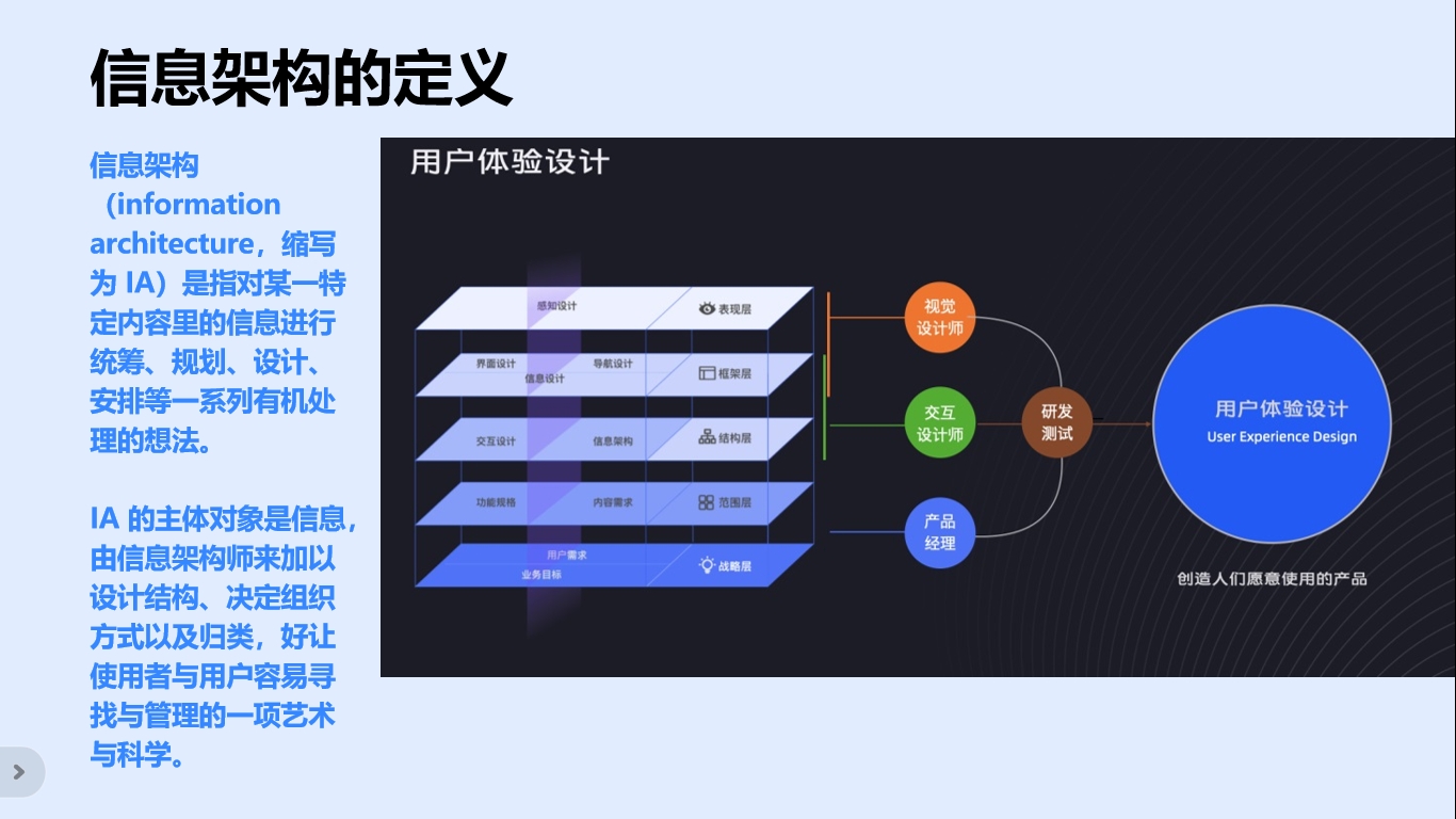 信息架构(information architecture,缩写为 IA)是指对某一特定内容里的信息进行统筹、规划、设计、安排等一系列有机处理的想法。IA 的主体对象是信息,由信息架构师来加以设计结构、决定组织方式以及归类,好让使用者与用户容易寻找与管理的一项艺术与科学,如图6。