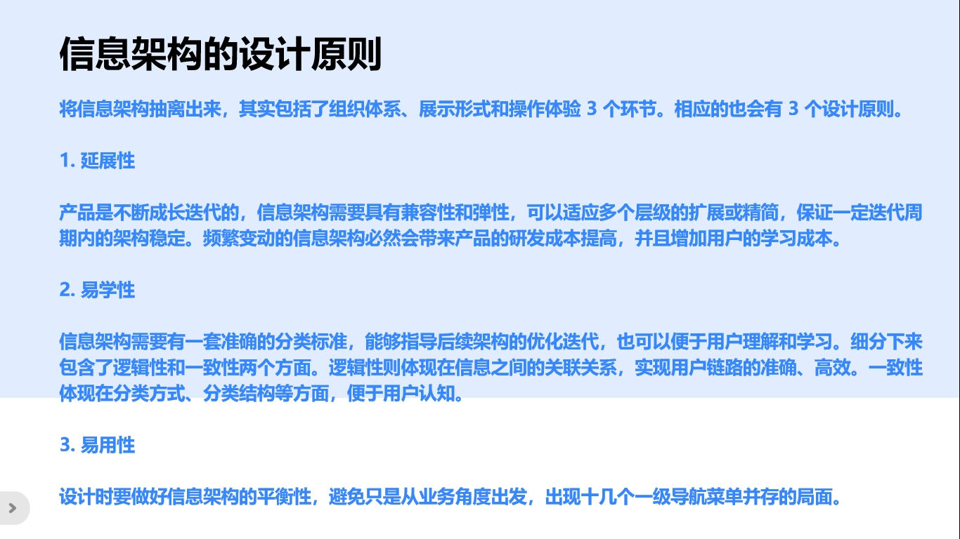 将信息架构抽离出来,其实包括了组织体系、展示形式和操作体验 3 个环节。相应的也会有 3 个设计原则,如图9。